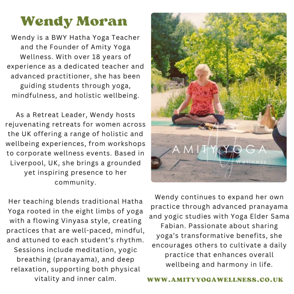 “I’m Wendy Moran, founder of Amity Yoga Wellness. As a Hatha Yoga teacher and retreat leader. I’m dedicated to helping others find balance, vitality, and inner peace through mindful, accessible yoga and holistic wellbeing practices.