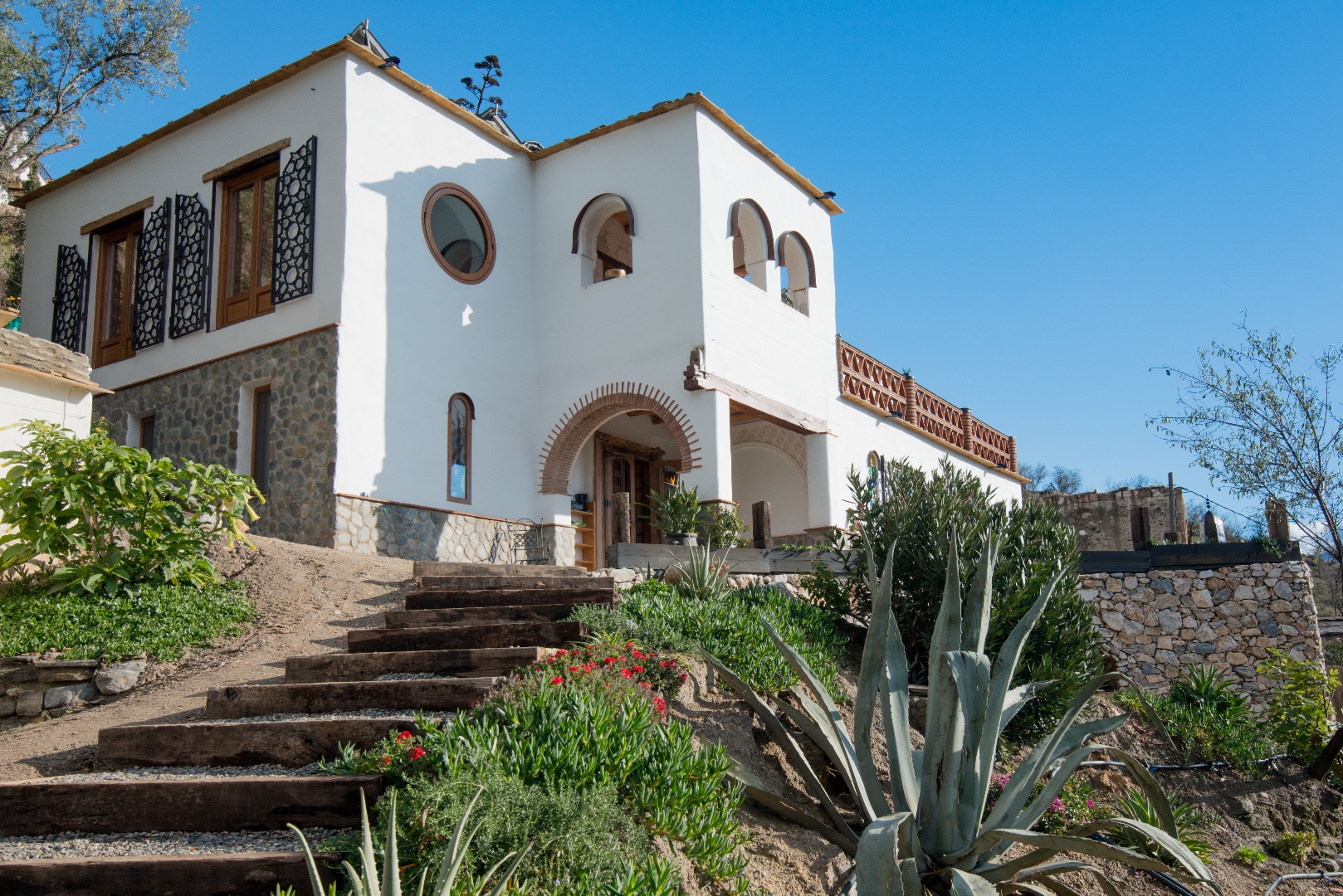 House of Light is set in 15000m2 of garden, this is mountain terrain, steep and terraced with fruit and nut trees, ancient olives and various flowering trees, bushes and succulents. There are plenty of contemplative corners where you can sit and take in the breathtaking views. Connecting with nature, breathing clean, fresh air and gazing over the mountain ridges to the sea.